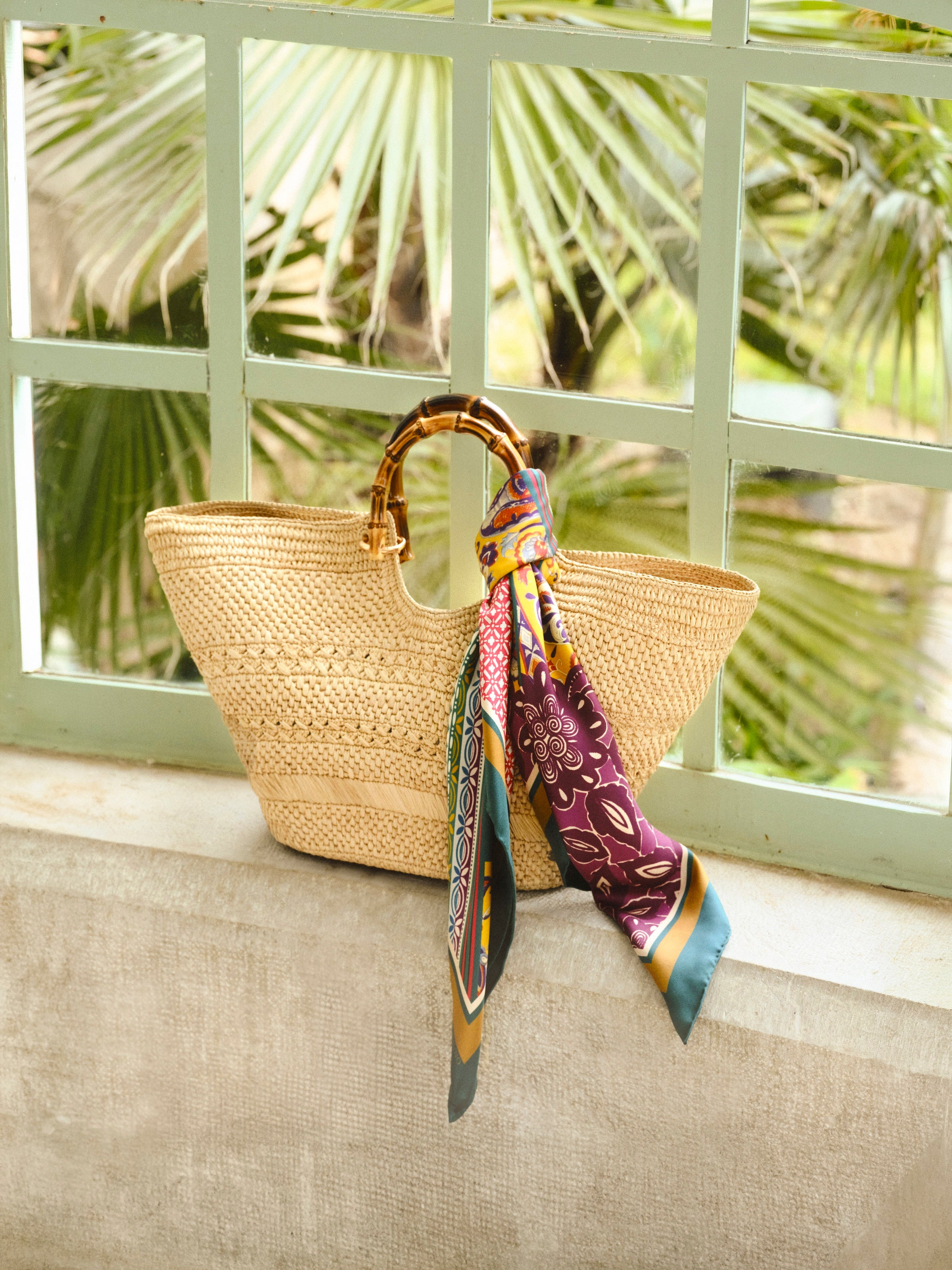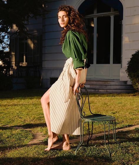 This bucket bag is made from smooth leather with an elegant, feminine openwork design. It has a knotted rope top handle for a natural, summery touch. Gold-tone metal detailing adds a sophisticated touch. The bag has an adjustable shoulder strap for convenient carrying over the shoulder or across the body. Inside, there's an integrated pocket fastened with a leather drawstring. Ideal for chic casual wear.